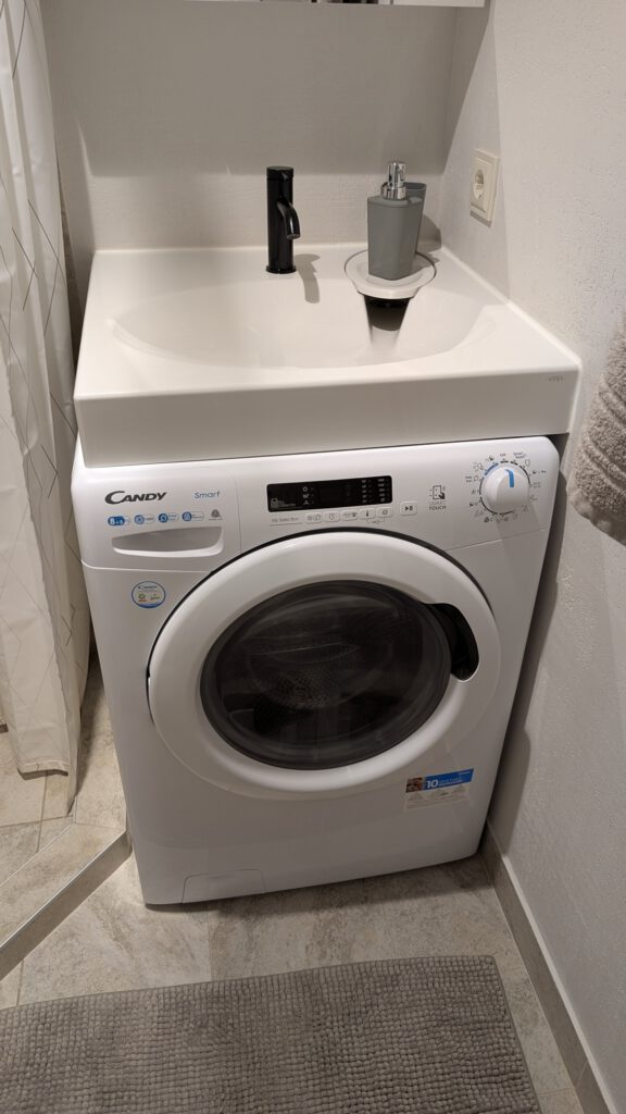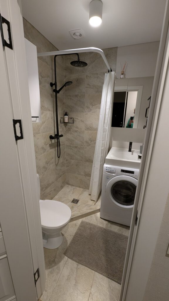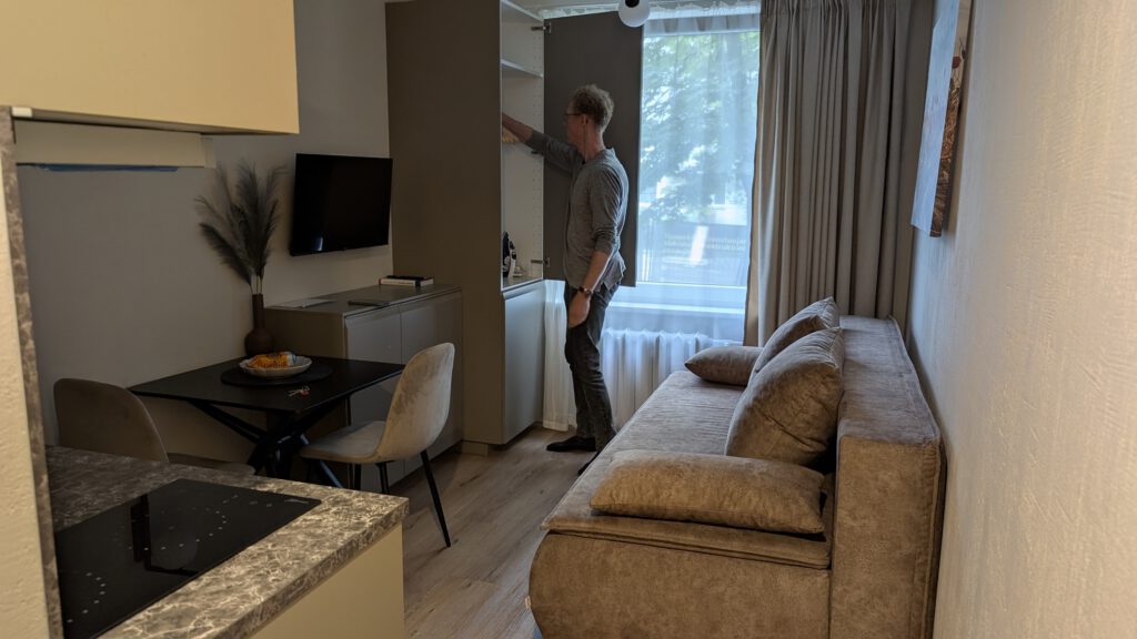 Na een ruime AirBnB in Kaunas belandden we in Vilnius in een schoenendoos van 15 m². Maar alles zat erin: een bank die tegelijk bed is, een wc, douche, wasbak én zelfs een wasmachine, allemaal op 1,5 x 1,5 meter. Ingenieus ontworpen, maar je moet wel van puzzelwonen houden.