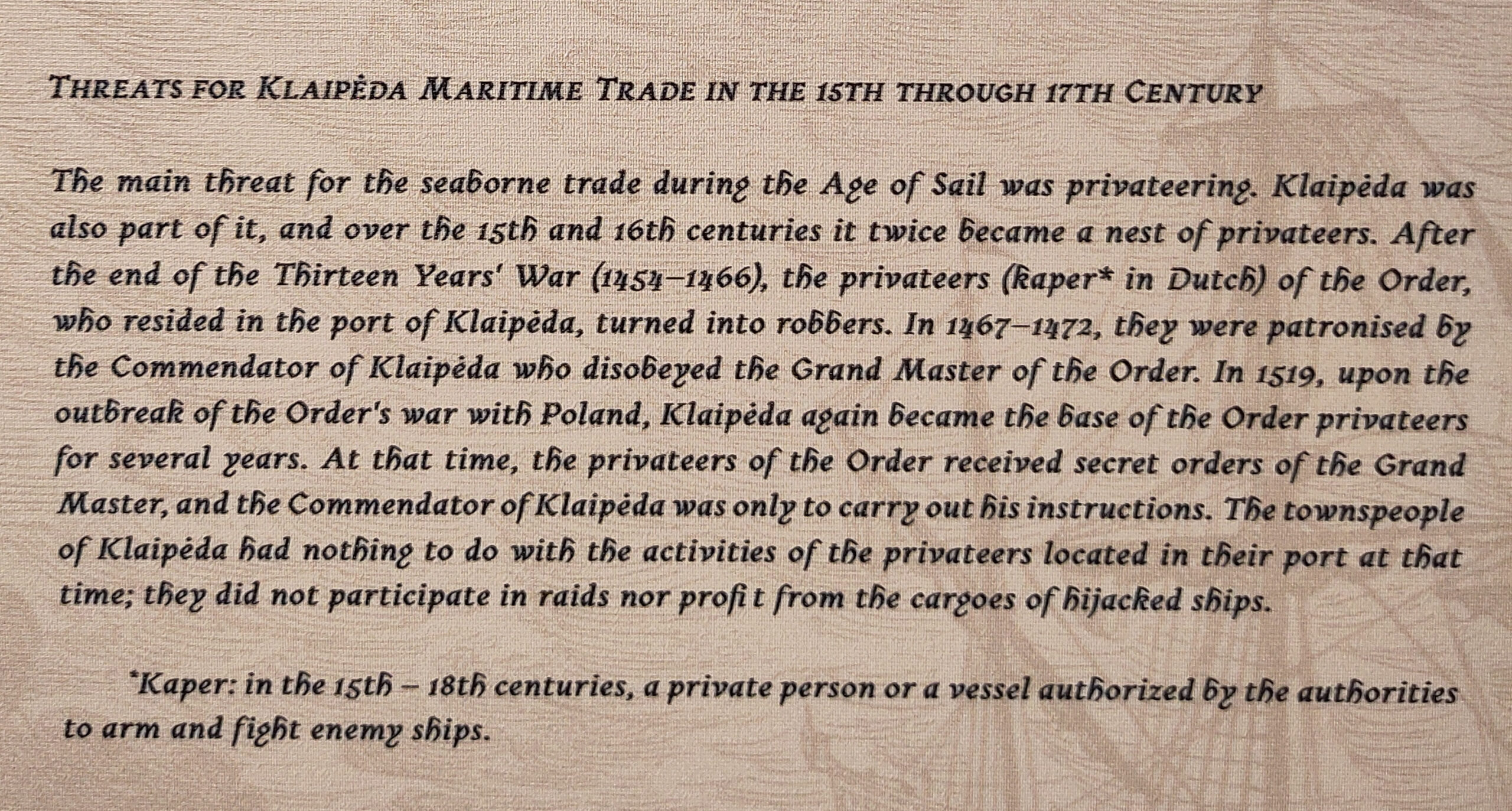 In Klaipėda bezochten we de resten van een fort. Daar stuitten we op verrassend veel Hollandse sporen: een oude Oostzee-kaart van Nederlandse makelij en een verhaal over kapers, waarbij uitgelegd werd wat dit Nederlandse woord betekent: iemand die officieel toestemming kreeg om anderen aan te vallen. Toch weer details om ’trots’ op te zijn.